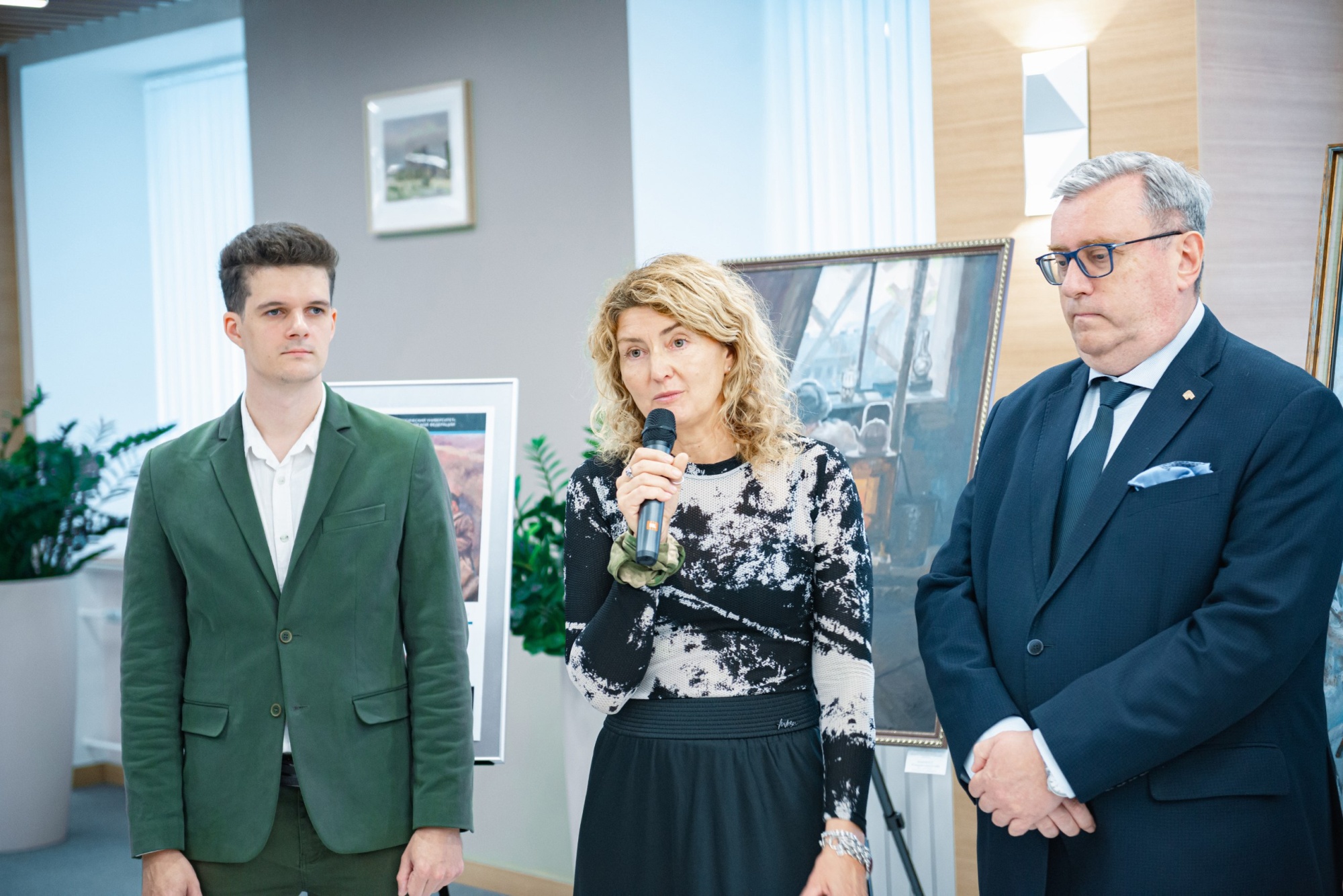 В Министерстве просвещения Российской Федерации 3 сентября торжественно открыли выставку творческих работ студентов художественно-графического факультета Института изящных искусств Московского педагогического государственного университета (МПГУ) «Память поколений: молодые художники – о войне и мире». Участие в мероприятии приняла заместитель Министра просвещения РФ Ольга Колударова.